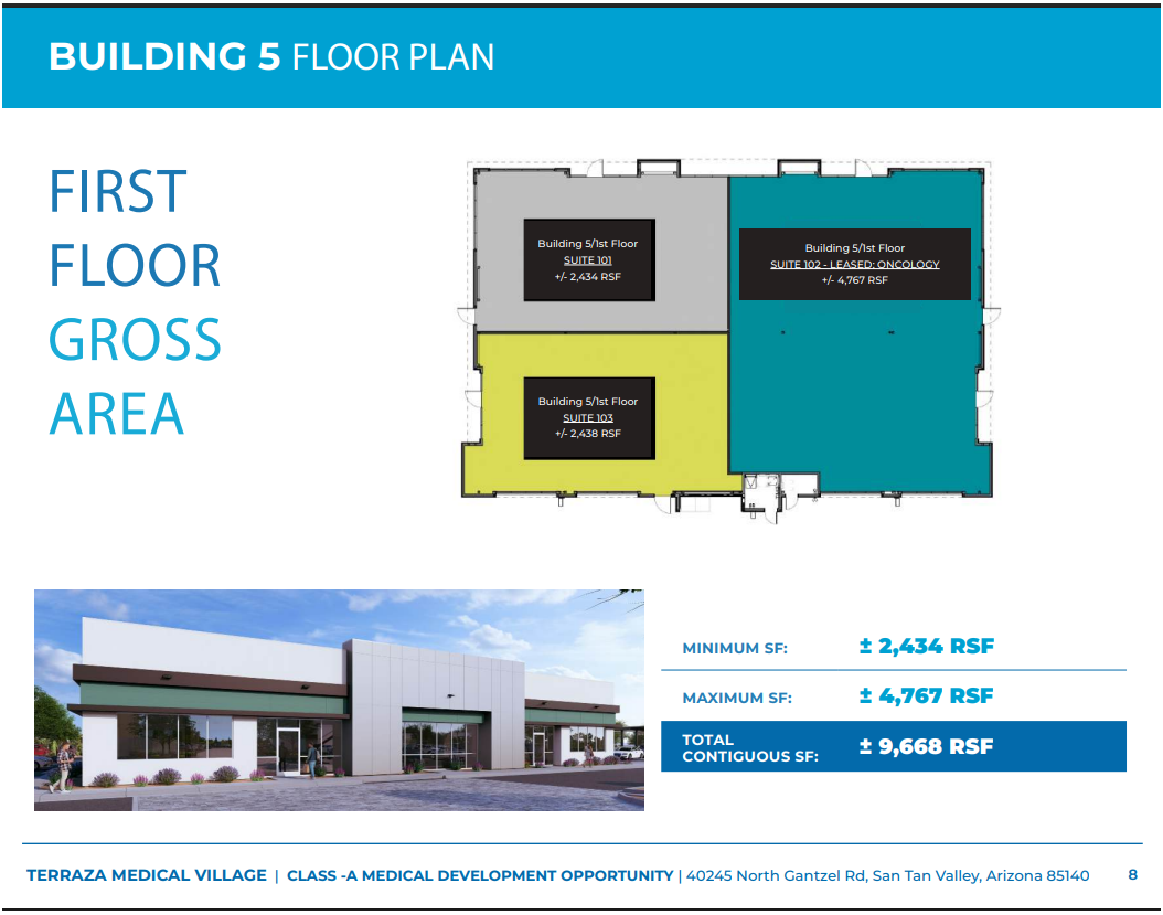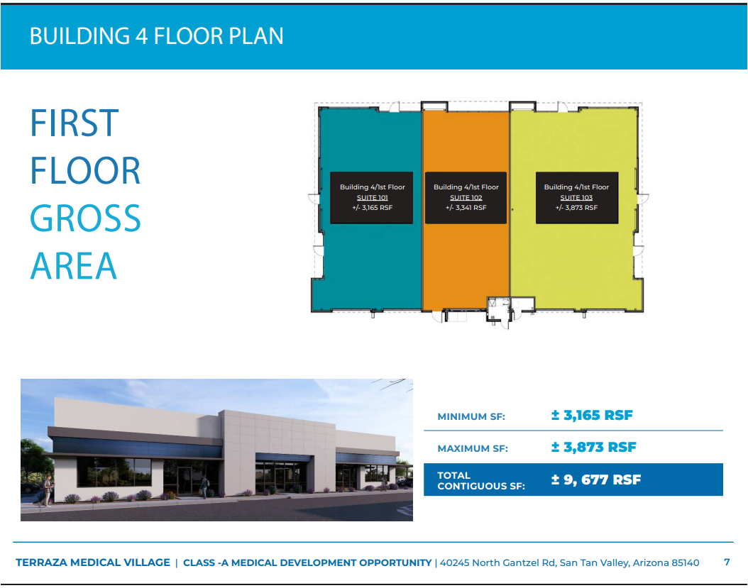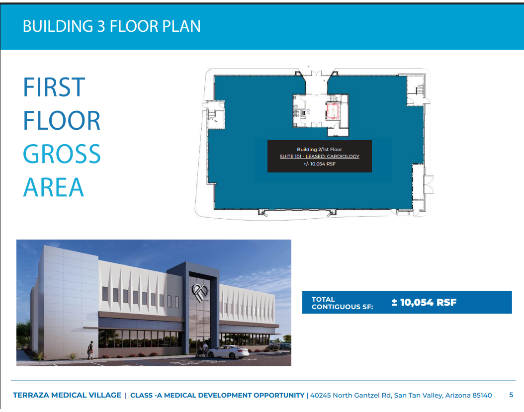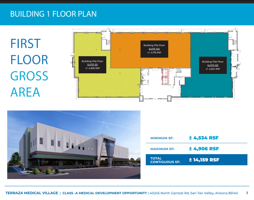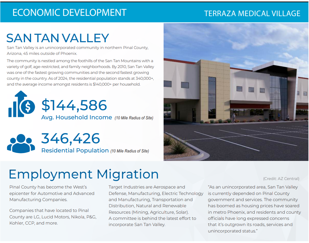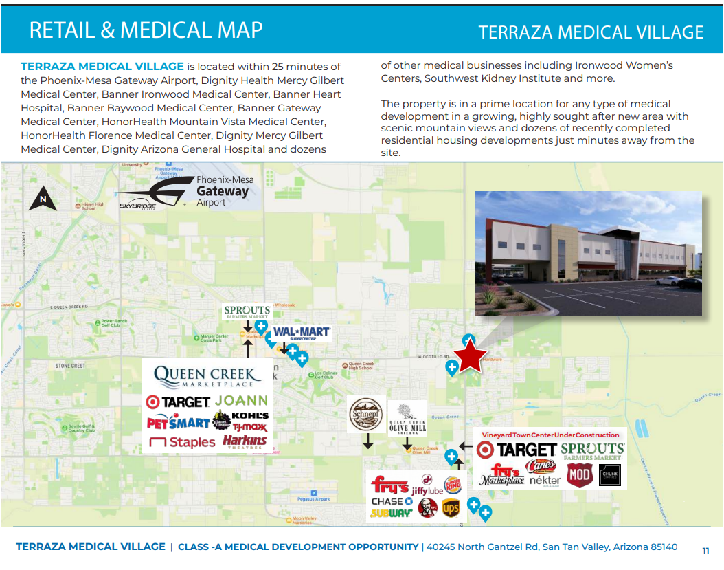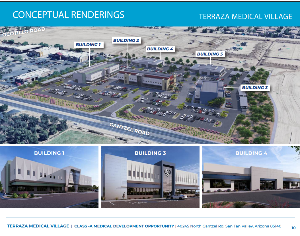 The Terraza Medical Village is located at the intersection of Gantzel & Ocotillo roads in San Tan Valley outside of Phoenix, Arizona. This medical complex is located within 25 minutes of Banner Ironwood Medical Center, Dignity Health Mercy Gilbert Medical Center, Phoenix-Mesa Gateway Airport, and dozens of other medical businesses including Ironwood Women’s Centers, Southwest Kidney Institute and more.